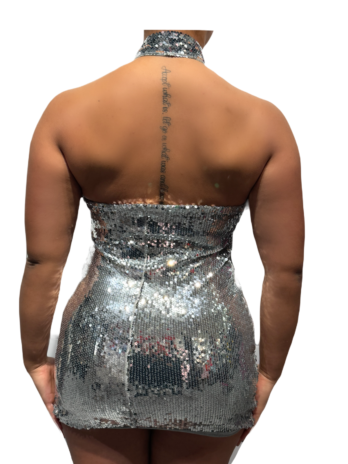 A dazzling silver mini dress covered in high-shine sparkles that catch the light from every angle, creating a bold, luminous look perfect for parties and nights out.